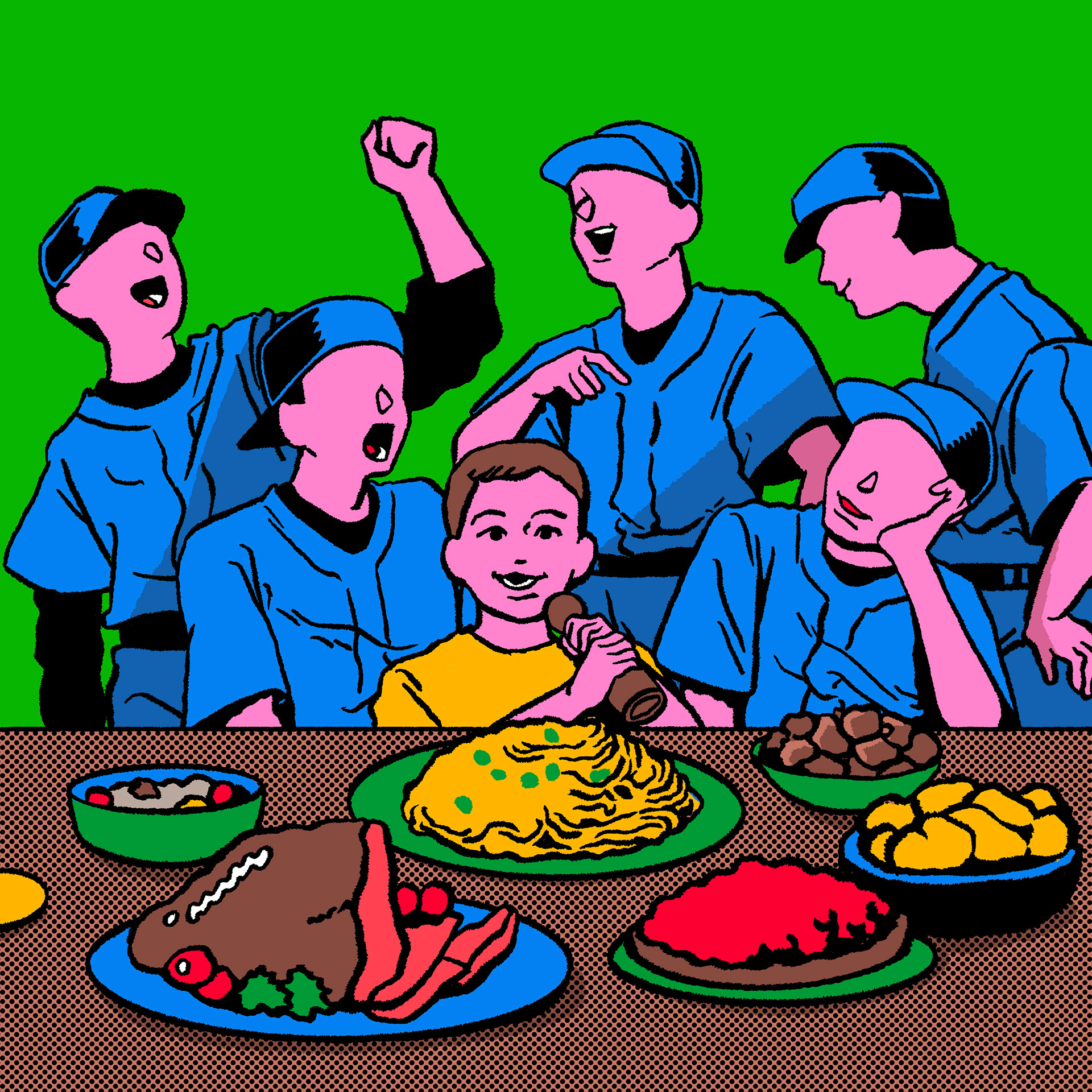 Left: Little Noot watching Japanese players. Right: Childhood meals with his host family. Original illustrations by Chiaki Harada
