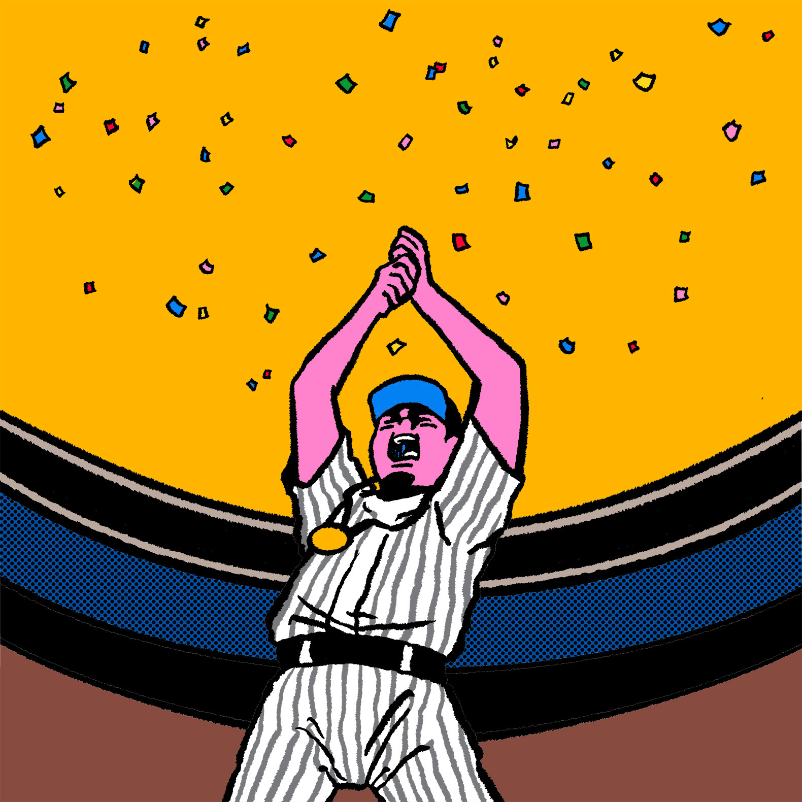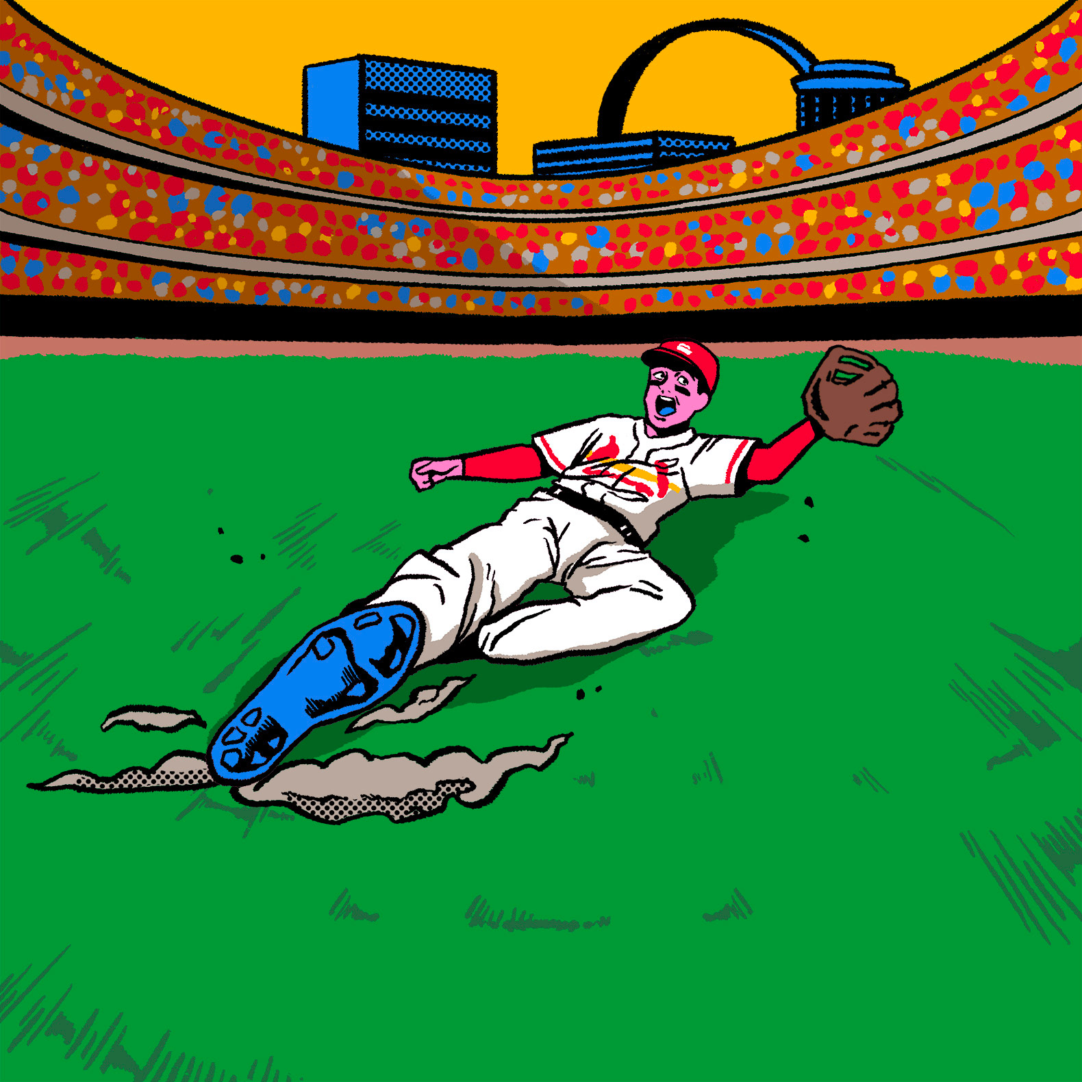 Left: Noot's Celebration wearing the Japan uniform. Right: Slide catch for the Cardinals. Original illustrations by Chiaki Harada