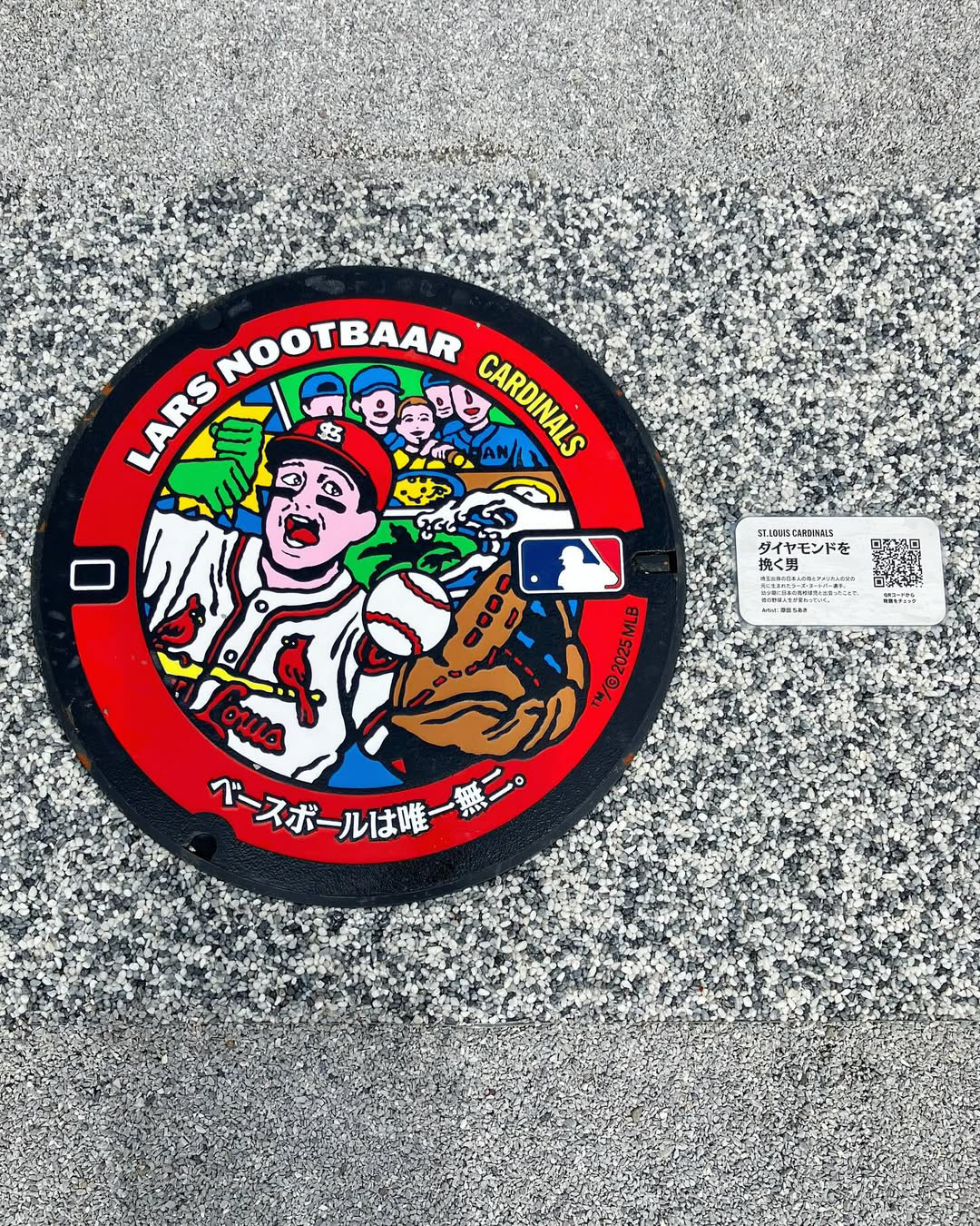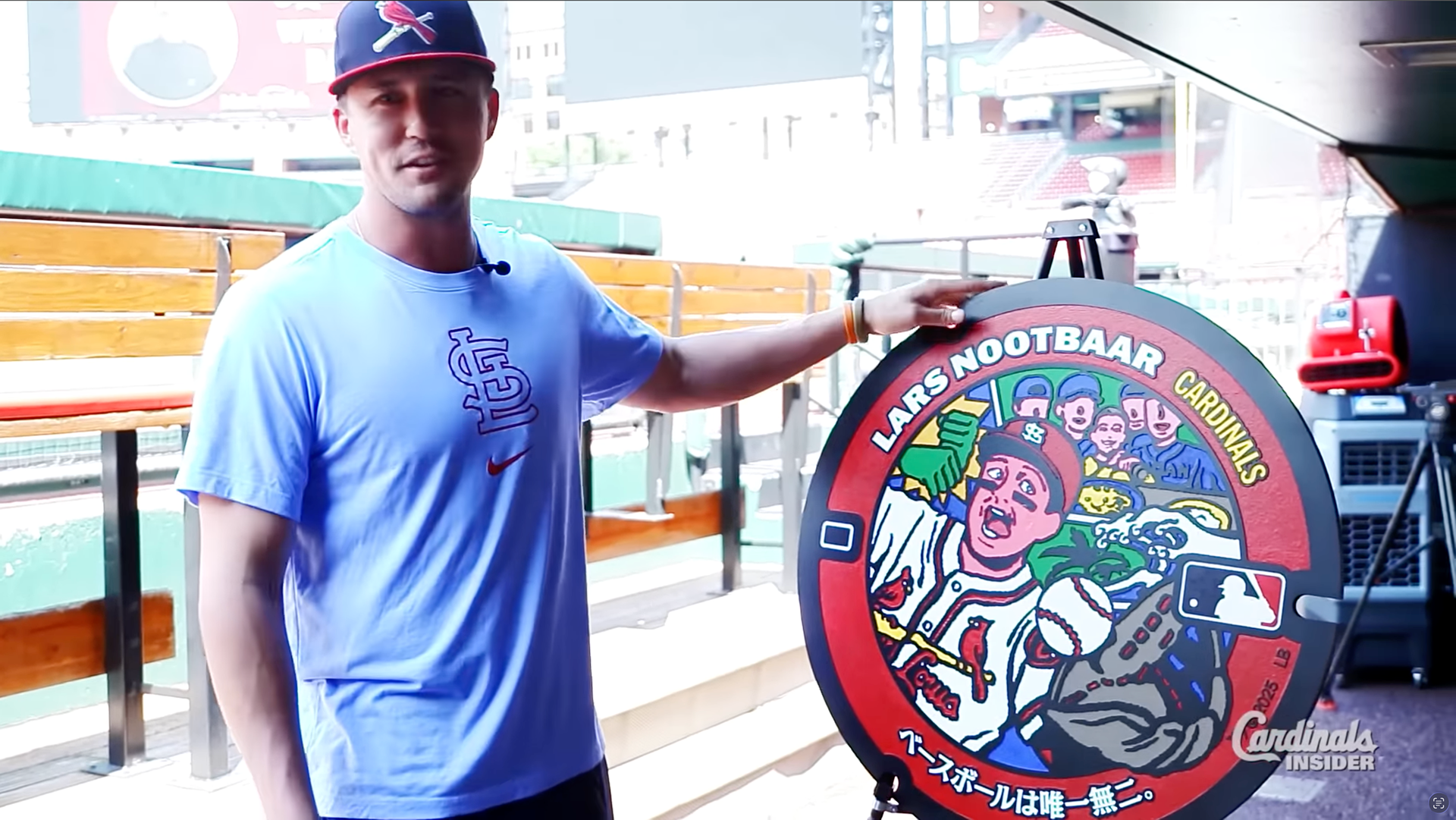 Lars Nootbaar uncovering his customised manhole cover. Image courtesy of Cardinals Insider (youtube)